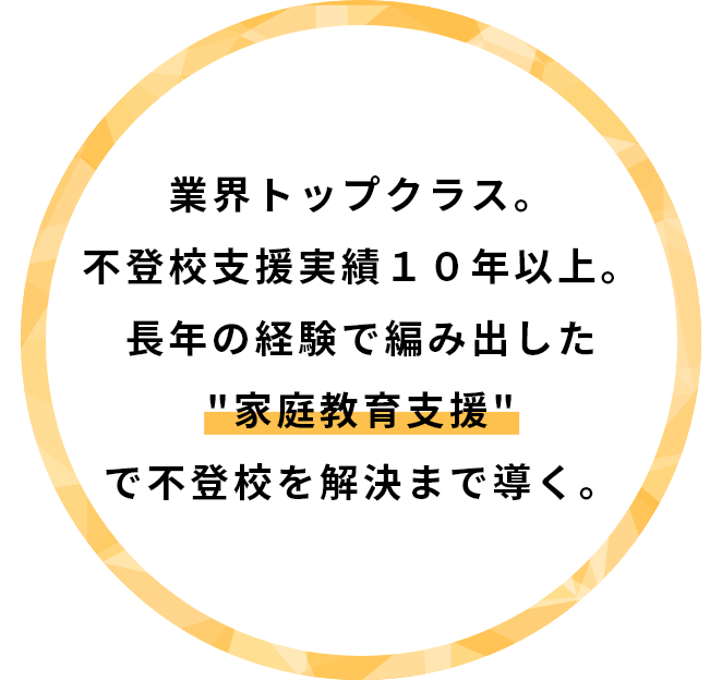 親の子育てスタンス、普段の声掛け方法、親子の関係性…といった観点から、家庭内に問題がないか、誰かにストレスが溜まっていないか、子どもの自立を阻むものがないか、信頼関係の揺らぎがないかなどを分析し、解決策の糸口を探し、お子さんの不登校や引きこもりを支援します。